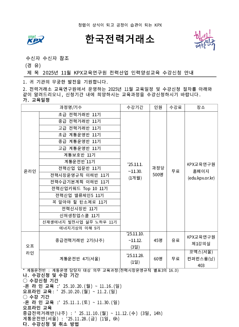 fnctId=bbs,fnctNo=884 2025년 11월 KPX 교육연구원 전력산업 인력양성교육 수강신청 안내 작성일2025.10.17 수정일2025.10.17 작성자 송*란 조회수25 첨부파일 첨부파일이(가) 없습니다.