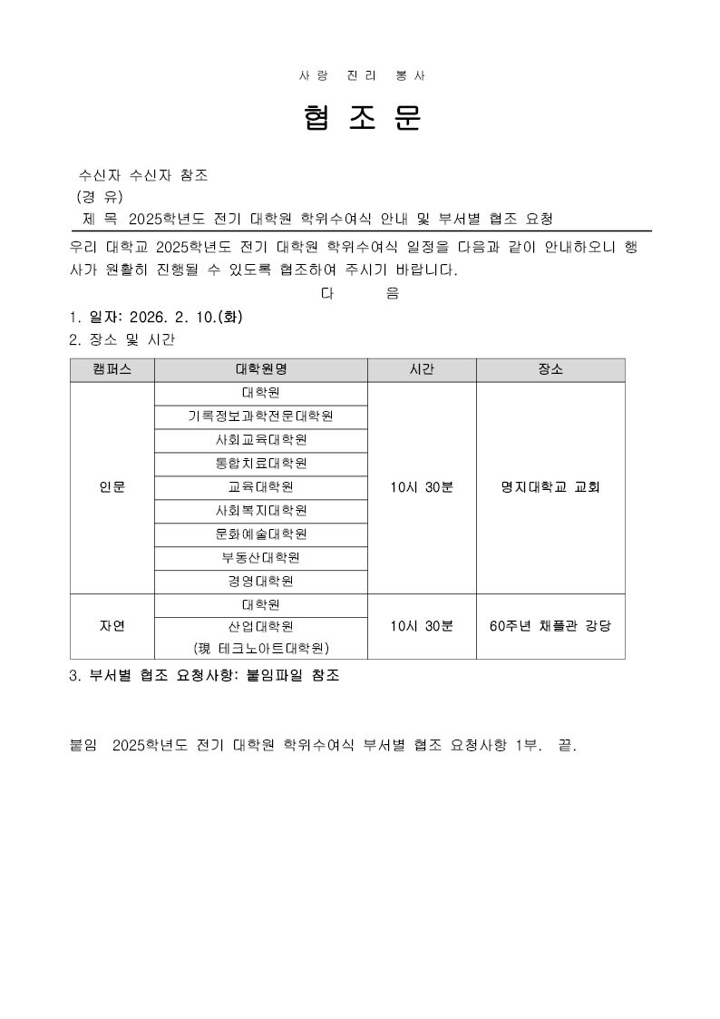 fnctId=bbs,fnctNo=884 2025학년도 전기(2026년 2월) 대학원 학위수여식 안내 작성일2026.01.28 수정일2026.01.28 작성자 송*란 조회수41 2025학년도 전기 대학원 학위수여식을 다음과 같이 안내하오니, 졸업생 및 가족 여러분들께서는 참석 하시어 자리를 빛내주시기 바랍니다. 첨부파일 2025학년도 전기 대학원 학위수여식 부서별 협조사항.pdf