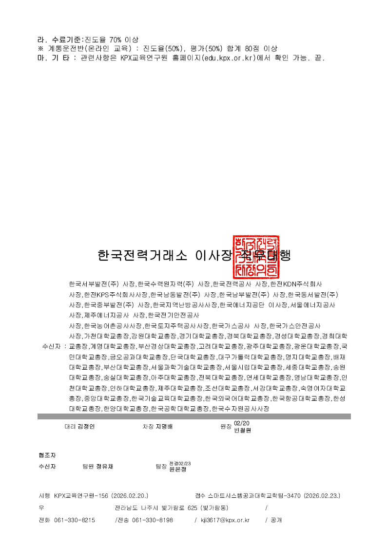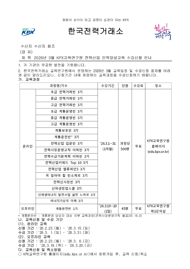 2026년 3월 KPX교육연구원 전력산업 인력양성교육 수강신청 안내